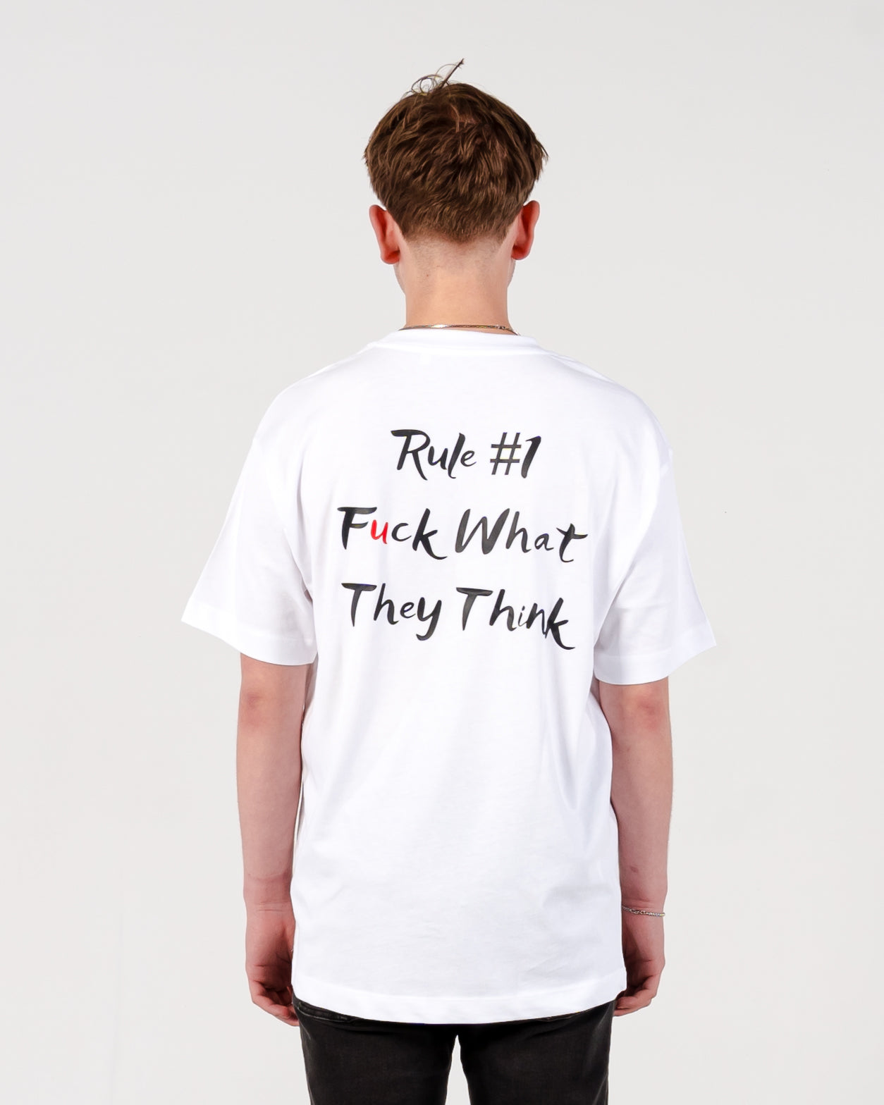 A high-quality product using a design of the quote "Rule #1 Fuck What They Think" Heavyweight available in all sizes and fits normally.